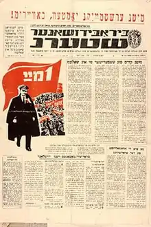 Birobidzhaner Shtern was established on October 30, 1930.[5] Jankel Levin was first editor of the newspaper. He received the first printing equipment from China.[6] Emmanuil Kazakevich, who was awarded the Stalin-Prize twice, the highest literary award in the country,[7] was an author and staff member of the newspaper in 1935–1938. During the Second World War, Birobidzhaner Shtern became part of the newspaper “Birobidzhanskaya Zvezda”. In May 1945 the Birobidzhaner Shtern resumed its independent edition.[6] The Jewish Autonomous Oblast had been set up by the Soviet government in an attempt to resolve the Jewish Question and provide an alternative to the Zionist Jewish experience offered later by Israel. The publication was interrupted in 1949 and continued since 1952.[8] According to official data it had an edition of 12,000 in 1970.[9] Birobidzhaner Shtern was the only newspaper in Russia that contained a section in Yiddish.