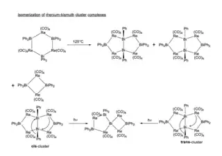 In 2009, Pearl et al. described the synthesis and isomerization of heterometallic complexes containing bismuth and rhenium. The precursors used in synthesis were an alkene-coordinated carbonyl rhenium complex and BiPh3.[8] The reaction yields two types of heteronuclear bismuth-rhenium complexes and a homodinuclear rhenium one as a side product. Upon heating, the hexametallic tribismuth-trirhenium heteronuclear complex undergoes isomerization to cis- and trans-clusters containing the bicyclo [3.3.0] core (see scheme below). Under subsequent irradiation both stereoisomers convert to a common spiro [4.3] cluster compound.[8]