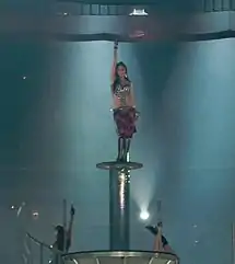 It was performed on the Rhythm Nation 1814 World Tour, in a "pyrotechnic interpretation" which ends using illusionary magic of Jackson transforming into a panther in a cage.[73][74] During the act, "menacing, feline dancers forced Jackson into a cage and covered it with a silver cloth. When they pulled it off, a real, live panther was prowling inside."[75] The performance was also considered as "a rocker booming with guitar solos and fireworks", commended for "utilizing illusions" to entertain the crowd.[50] Dave Tianen of The Sentinel added, "Shifting emotions as quickly as she shifted her head, shoulders, and hips, Jackson and crew launched into a thrashing version of "Black Cat", completed by whining guitar rifts comparable to much heavy metal."[48] On the tour's opening night, Jackson stated, "The black cat, he peed - on stage!", causing her and several dancers to slip and fall while performing.[59] The panther, named Rhythm, was subsequently removed from the tour after the first leg due to safety concerns, as well as her own love of animals.[76]