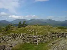 A bridleway runs across the fell from the summit of the A593 in the west to Knipe Fold in the east, locally known as the "mountain road".[1] A further footpath branches off northward to the vicinity of Skelwith Bridge, providing the best access to the summit. This bears an Ordnance Survey triangulation column complete with a National Trust sign. 200 yards to the east a prominent cairn marks the best viewpoint for Windermere, whilst northerly views can be improved by the short march to Great Cobble. The panorama takes in both the high Coniston and Langdale Fells, and the lowlands and lakes to the south and west, a fine distillation of what Cumbria has to offer.[5]