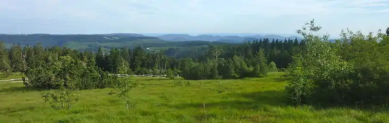 The greater part of the Ruhestein area extends reaches a height of approximately 1,150 m above NHN near Dreifürstenstein in the southeasternmost summit region of the Hornisgrinde, the highest mountain in the northern Black Forest. Other summits are the bird's head (Vogelskopf) (1,056 m) and the Schliffkopf (1,054 m) to the west, the Seekopf (1,054 m) in the northwest, the Riesenköpfle (1,001 m) in the centre, the Leinkopf (992 m) in the north and the Großhahnberg (940 m) in the northeast. In this southern part of the National Park are the tarns of Wildsee, Huzenbacher See and Buhlbachsee and the upper Schönmünz valley and the headwaters of the Murg headstreams, the Rechtmurg and Rotmurg and other Murg tributaries. On the western slopes of the Schliffkopf this subregions extends down as far as the All Saints Waterfalls, where it reaches is lowest and most westerly point at a height of approximately 500 m. Excluded from the Ruhestein area are the Ruhestein itself with its two ski slopes and the Great Ruhestein Ski Jump, the Darmstädter Hut, the Schliffkopf Hotel, the Rotmurg Hunting Lodge, the hamlet of Schonmünz (Volzenhäuser) and other small areas. The state forest land here belongs mainly to the collective municipality of Baiersbronn (in the county of Freudenstadt), other elements belong to Oppenau, Ottenhöfen and Seebach (in the county of Ortenaukreis).[7][8]