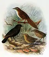 The black robin or Chatham Island robin (Moriori: karure, Māori: kakaruia; Petroica traversi) is an endangered bird from the Chatham Islands off the east coast of New Zealand. It is closely related to the South Island robin (P. australis). It was first described by Walter Buller in 1872. The binomial commemorates the New Zealand botanist Henry H. Travers (1844–1928). Unlike its mainland counterparts, its flight capacity is somewhat reduced. Evolution in the absence of mammalian predators made it vulnerable to introduced species, such as cats and rats, and it became extinct on the main island of the Chatham group before 1871, being restricted to Little Mangere Island thereafter.[2]