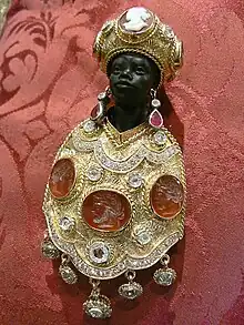 In jewelry, blackamoor figures usually appear in antique Venetian earrings, bracelets, cuff links, and brooches (Moretto Veneziano). Blackamoor jewelry is also traditionally produced, based on legend found in Fiume, such as earrings and brooches under the name Morčić or Moretto Fiumano.[4][5][6]