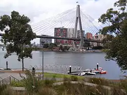 View of ANZAC Bridge from dragon boat on Blackwattle Bay