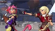 The game also includes Kit's alien sidekick Skiffy and her floating sword called a Darque Blade. She is able to swing her sword at close range or send it flying over a larger distance to attack enemies and hit inaccessible switches. While progressing through the game, the sword can be upgraded and changed to four different types of blade that can deal either higher amounts of damage, faster attack speed or auto lock-on. She can also ride dinosaur style animals called Noots over the plains of Hollow Wish.