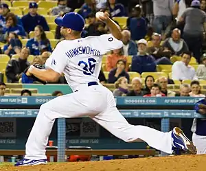 Hawksworth began feeling tenderness and discomfort in his elbow during the offseason and underwent elbow surgery in early January 2012. This injury caused him to be placed on the 60-day disabled list at the start of the season.[7] He began a rehab assignment in June but was shut down after a couple of appearances due to shoulder soreness.[8] On August 23, he underwent arthroscopic shoulder surgery, which ended any chance he had to return in 2012 and the report from the team was that he might also miss the 2013 season as a result of the recovery period.[9] On October 12, 2012 the Dodgers outrighted him to AAA and removed him from the 40-man roster. On October 17, he elected to become a free agent.