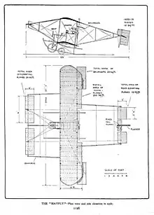 The completed Mayfly was a small pusher configuration equal span biplane. Ash was used for the wing spars and the skids, spruce for the ribs and interplane struts, bamboo for the booms carrying the elevator and tail surfaces and the engine mounting was American Elm.[7] The wings were covered in unbleached calico, which was laced to the wing structure, allowing it to be tightened when it stretched. [note 1] It was powered by a 20 hp (15 kW) air-cooled horizontally-opposed two-cylinder engine made by Avro, who also supplied the propeller and various metal fittings used.[8] The forward- mounted elevator was divided into two halves and carried on three pairs of converging booms: behind the wings two paired booms carried a small rectangular fixed tailplane with an elevator either side, and a small fin and rudder. The undercarriage consisted of a pair of long skids bearing a pair of unsprung wheels upon which the aircraft rested: in front of these was a large nosewheel.