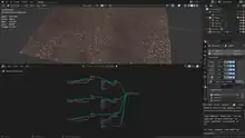 New Asset Browser editor with Pose library.[126][127][128] USD importer.[129] Geometry Nodes Curve support[130][131][132] and new fields system which makes geometry nodes more like working with shaders.[133][134] A new posterize node for the compositor.[135] Dash to Dot grease pencil modifier.[136] Spreadsheet editor improvements.[137] Merging of the Cycles X branch giving performance improvements.[138][139][140] Removal of branched path tracing and OpenCL rendering.[141] Cycles HIP support for AMD graphics cards.[142] EEVEE support for the wavelength node and the attribute node.[143] The VR inspection add-on now supports controller visualisation and navigation functionality such as teleporting, flying and grabbing.[144] Video Sequence editor Thumbnails,[145][146] Transform tools[147][146] and an increase of strip limit from 32 to 128.[148][146][149] Knife tool improvements from the Google Summer of Code.[150][146][151] Modelling performance improvements.[152] A new design for Panels[153] and Nodes,[154] Node Editor overlays for noodle colours and annotations,[155][156] node editors now have a dot grid,[157] Theme changes[158] and other UI tweaks.,[159] Version 3.0.1 with bugfixes |