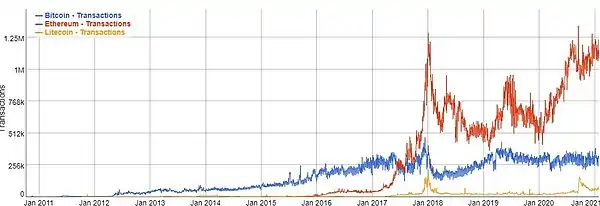 In August 2014, the bitcoin blockchain file size, containing records of all transactions that have occurred on the network, reached 20 GB (gigabytes).[14] In January 2015, the size had grown to almost 30 GB, and from January 2016 to January 2017, the bitcoin blockchain grew from 50 GB to 100 GB in size. The ledger size had exceeded 200 GB by early 2020.[15]