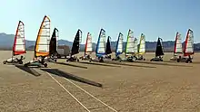 Racing differs to other land yacht racing - which typically has stationary starts and race across the wind on beaches. It actually has more in common with water based sailing, with 2-3 minute dial-up starts and windward/leeward courses. Racing is held on purpose built tracks, airport runways, parking areas as well as beaches and dry lake beds. Races are between 5 minutes and 8 minutes in duration.