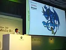 Hironobu Sakaguchi giving a presentation on Blue Dragon at the 2006 Tokyo Game Show convention.