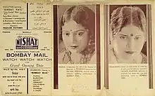 Bombay Mail (बॉम्बे मेल) is a 1935 Hindi-language Indian film directed by Rasik Bhatt for Vijay Bhatt and Shanker Bhatt's Prakash Pictures. The cast includes leading lady Panna, supporting actress Rajkumari, both of whom had starred in the brothers' previous film, Sacred Scandal (1934), alongside senior character actor Jayant, Umakant, Esmail, Rajababu and S. Nazir.[1] Music for Bombay Mail included ten songs by the Bhatt brothers' regular music director Lalubhai Nayak, including "Kaaga re jaiyo piya ki" and "Kis ki aamad ka yoon", both sung by the senior actress, later known by full name Rajkumari Dubey.[2][3]