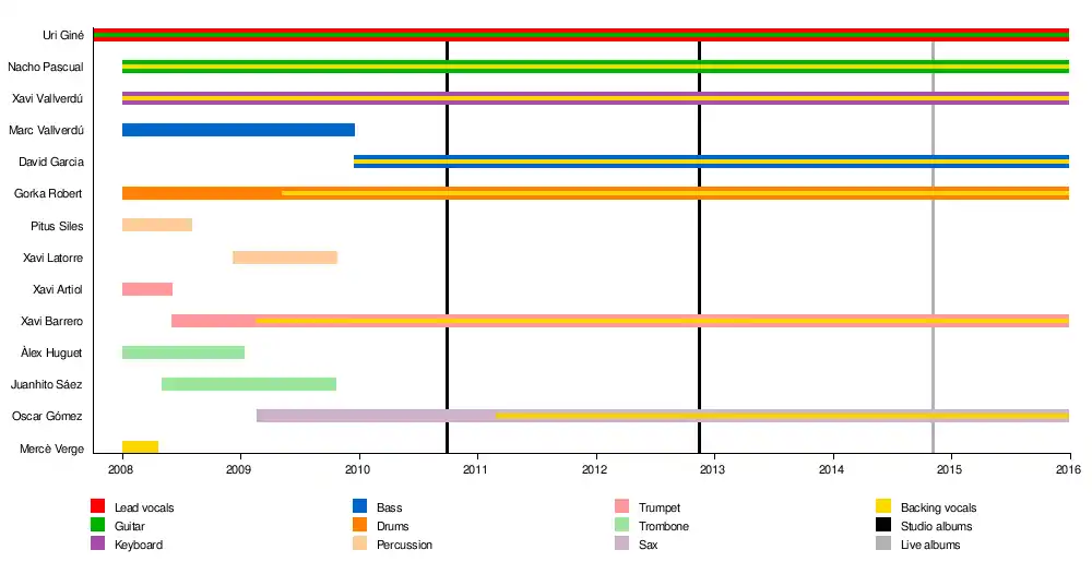 There were some line-up changes in 2008 and early 2009: Mercè Verge left the band, Xavi Latorre replaced Pitus Siles on percussion, Xavi Barrero replaced Xavi Artiol on trumpet, Juanhito Saez replaced Àlex Huguet on trombone and Oscar Gómez joined the band as saxophonist.[5][6][7]