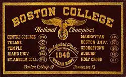 Perhaps the best football team in Boston College history, the undefeated 1940 Eagles (11-0) won the 1941 Sugar Bowl over previously unbeaten No. 4 Tennessee. The school claims this year as a national championship.[84] However, the team was not chosen by any NCAA-designated "major selectors" of national championships and does not appear in the NCAA records book.[85]
