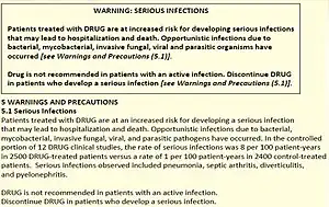 In the United States, a boxed warning (sometimes "black box warning", colloquially) is a type of warning that appears near the beginning of the package insert for certain prescription drugs, so called because the U.S. Food and Drug Administration specifies that it is formatted with a 'box' or border around the text[1] to emphasize it is of utmost importance.[2] The FDA can require a pharmaceutical company to place a boxed warning. It is the strongest warning that the FDA requires, and signifies that medical studies indicate that the drug carries a significant risk of preventable, serious or even life-threatening adverse effects.[2][3]