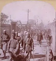 In the English speaking world, the group came to be known as the "Boxers", due to its members' practice of Chinese martial arts, at the time called "Chinese boxing".[1][2] Though the group had existed since the mid-1880s, it was first reported externally as the "National Righteousness Group" (義民會; 义民会; Yìmínhuì; I-Min Hui) in an 1899 Qing report intent on solving disturbances in the Shandong and Zhili Provinces.[3] This is later clarified in a follow-up report to have been a mistake, and that the actual name is in fact "League of Harmony and Justice" (義和團; 义和团; Yìhétuán; I-Ho T'uan), alternatively translated as "Militia United in Righteousness". During 1898, the group was known as the Plum Blossom Fists (梅花拳; Méihuāquán; Mei-Hua Ch'üan), though this name would not be used into 1899 and after.[4] In more recent English publications, the name of the group from 1899, variously translated as "Society of Righteous and Harmonious Fists" or "Fists of Harmony and Justice" (義和拳; 义和拳; Yìhéquán; I-Ho Ch'üan),[5] tends to be used over the yìhétuán-based name. The group is also sometimes known in English by any one of its Chinese names, with more recent publications tending to use Pinyin, and older publications using Wade–Giles or other systems.[6]