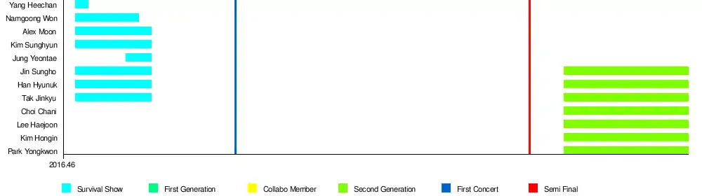 The survival show with the same name as the group was a 2016 reality boy group unit survival show that aired every Saturday 10pm on Mnet and tvN. It was a large-scale project in which the units of a selected number of members would be produced from a pool of 49 free-agents.[44]