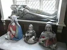- William Walrond (1610-1667/9) (eldest son), who in 1637 married Ursula Specott (died 1698), daughter of Humphrey Specott of Launcells in Cornwall. Ursula was buried at Kentisbeare. A chest tomb exists in Bradfield Chapel, north aisle, Uffculme Church. The arms above the relief bust figure on the right are those of Specott (Or, on a bend gules three millrinds of the first) and the bust portrays William. His grandfather, also William, is shown on the left side in a relief bust below a cartouche with the Walrond arms. Five standing female figures are shown, at the west end, a blindfolded Justice, also Faith Hope & Charity.[20] The chest tomb is complete in itself, and the half-figures presently placed on top of it belong to a former now broken up monument, probably that of the reclining Sir William Walrond (died 1689), whose effigy now occupied the window-ledge above. On the top slab is inscribed: