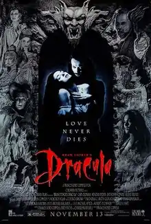 Bram Stoker's Dracula is a 1992 American vampire horror film produced and directed by Francis Ford Coppola and written by James V. Hart, based on the 1897 novel Dracula by Bram Stoker.[4][5][6] The film stars Gary Oldman, Winona Ryder, Anthony Hopkins, Keanu Reeves, Richard E. Grant, Cary Elwes, Billy Campbell, Sadie Frost, and Tom Waits. Set in 19th century England and Romania, it follows the titular vampire (Oldman), who falls in love with Mina Murray (Ryder), the fiancée of his solicitor Jonathan Harker (Reeves). When Dracula begins terrorizing Mina's friends, Professor Abraham Van Helsing (Hopkins), an expert in vampirism, is summoned to bring an end to his reign of terror. Its closing credits theme "Love Song for a Vampire", is written and performed by Annie Lennox.