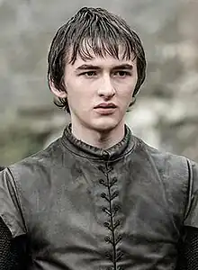 Martin describes Bran as favoring his mother in appearance, having the thick auburn hair and deep blue eyes of the Tullys.[6] According to Martin, Bran is strong willed, but a sweet and thoughtful boy, well-loved by everyone at Winterfell. Before his fall he enjoyed climbing and exploring the walls and ramparts of the castle. He grew up wanting to be a knight for the Kingsguard, but those dreams were quickly brought to an end when Bran had to face the fact that he will never walk again.[7][8] He is also dutiful and tough-minded.