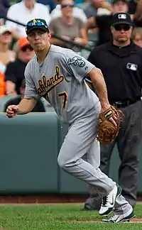 Inge agreed to sign with the Oakland Athletics on April 29, 2012 on a $5.5 million deal.[28] The signing provided infield depth for Oakland, who lost Scott Sizemore to a knee injury. He initially wore number 18, but switched to number 7 after a few games (his old #15 was worn by teammate Seth Smith). In his first game against the Tigers a week later, Inge hit a grand slam. On September 1, after dislocating his shoulder for the second time within a month, Inge was forced to undergo season ending shoulder surgery.[29]