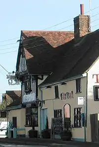 The village's oldest pub, the Brantham Bull, is a 16th-century grade 2 listed building.[4] Some of the beams from the building are thought to have come from the wreckage of the Spanish Armada, and over the centuries the building has also been used as a court house and a prison. Witchfinder general Matthew Hopkins, once hanged a lady by the name of Nancy on the green outside the front of the building. A passage used by smugglers used to run from the pub's cellar out to the River Stour.