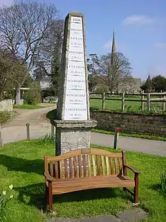 ![]() The milestone obelisk in Bredon, with the parish church of St Giles in the background.  | |