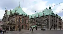 Bremen City Hall (German: Bremer Rathaus) is the seat of the President of the Senate and Mayor of Bremen, Germany. It is one of the most important examples of Brick Gothic and Weser Renaissance architecture in Europe. Since 1973, it has been a protected historical building.[1] In July 2004, along with the Bremen Roland statue, the building was added to the list of UNESCO World Heritage Sites because of its outstanding architecture and its testimony to the development of civic autonomy in the Holy Roman Empire.[2]