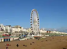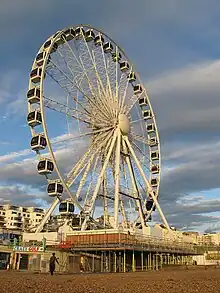 The Brighton Wheel, also known during its planning and construction phase as the Brighton O[3] and the Wheel of Excellence,[4] was a transportable Ferris wheel installation which operated from October 2011 until May 2016[1] on the seafront in Brighton, part of the English city of Brighton and Hove. Situated below the East Cliff near Brighton Pier and built with private funding, its promoters anticipated that several hundred thousand visitors per year would experience the 12-minute ride. The wheel's location in a conservation area with many residential buildings proved controversial.