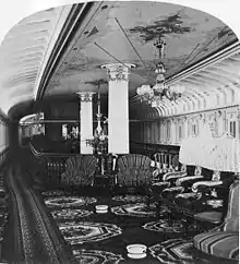 ... The painting, by George C. Barker & Son, and the decorating by Hayman, of this city, have been a source of enormous outlay, but the result is an equivalent to the cost, for the passenger, on arriving at the Quarter Deck and proceeding to the Grand Saloon, must certainly imagine that he is in the halls of enchantment, only read of in the Arabian Nights' Entertainments. In each panel of the quarter-deck is painted a piece of statuary, while every nook and corner is covered with paint of the most delicate hue and finished off with an abundance of gilt. The appearance of the main saloon is really charming. Here, there, and everywhere, are flowers and birds, the one, in some cases, just appearing to blossom and the other, apparently, just waiting to spring from a branch, whereon it is perched, so naturally is everything done. In the main saloon, ladies' saloon, and social hall, may be seen very delightful specimens of good taste in the selection of the new velvet carpets, rugs, mats, silk curtains, lace curtains, etc., all of which are of the very costliest kind. The whole of the furniture in the grand saloon and ladies' saloon is covered in plum colored velvet, while that of the social hall is done in velvet and rep, each having a very beautiful effect on the surroundings ...[1]