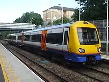 London Overground operated eight two-car Class 172s on the Gospel Oak to Barking line, replacing the old Class 150 stock. The units were originally meant to be in service from February 2010,[12] but due to production issues and then what were thought to be exhaust problems (which proved to be a false alarm),[13] the trains entered service only in July 2010, and at reduced capacity due to staff training problems. By December 2010 the whole fleet was in service, allowing the Class 150s to be cascaded to First Great Western and other operators. The units were leased by Angel Trains.[14]
