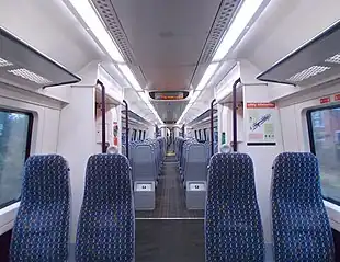Class 172s have fewer seats than the Class 150s they replaced,[8] but greater overall capacity due to the increased room for standing passengers as well as wider aisles intended to speed boarding and alighting and reduce waiting time in stations. The trains are air-conditioned and have no opening windows, unlike the Class 150s.