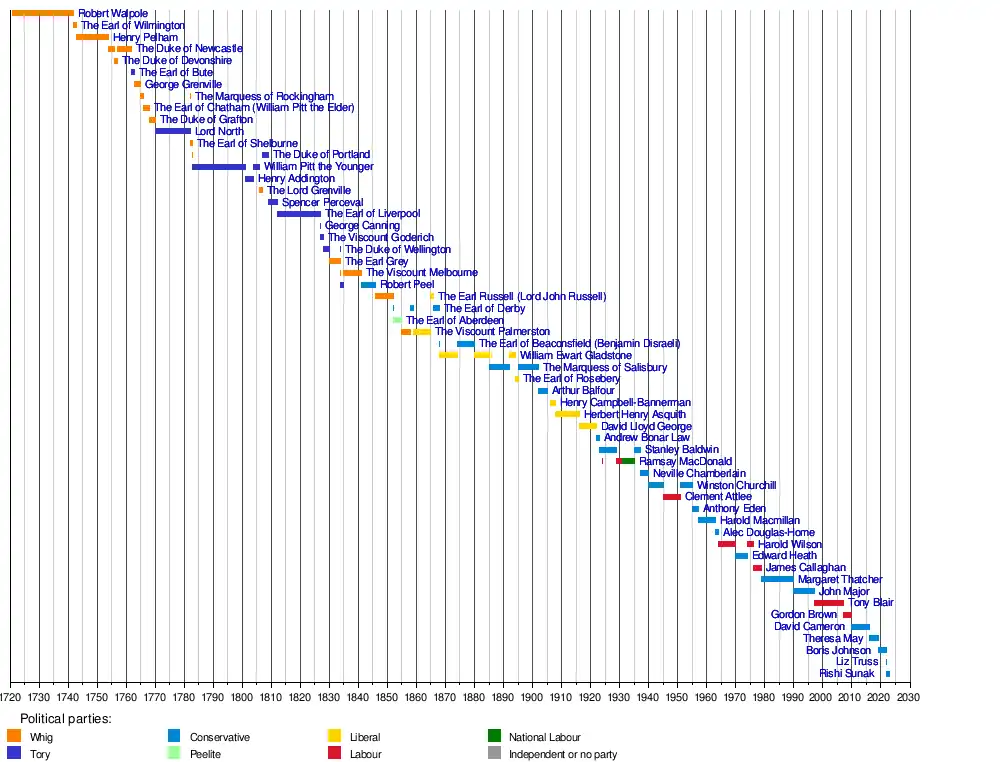 Modern historians generally consider Robert Walpole, who led the government of the Kingdom of Great Britain for over twenty years from 1721,[5] as the first prime minister. Walpole is also the longest-serving British prime minister by this definition.[6] By the same consideration the first prime minister of the United Kingdom of Great Britain and Ireland was William Pitt the Younger at its creation on 1 January 1801.[7] The first to use the title in an official act was Benjamin Disraeli, who, in 1878, signed the Treaty of Berlin as "Prime Minister of Her Britannic Majesty".[8]