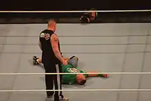 At SummerSlam on August 17, Lesnar defeated John Cena to win the WWE World Heavyweight Championship; during the match he delivered sixteen suplexes (most of which were German suplexes) and two F-5s to Cena, who barely managed any offense.[113] In a rematch at Night of Champions on September 21, Lesnar was disqualified due to Seth Rollins interfering, but retained his championship.[114] Later in the year, Rollins reunited with The Authority and was added to Lesnar and Cena championship match at the Royal Rumble on January 25, 2015, making it a triple threat match,[115] which Lesnar won despite (storyline) breaking a rib during the match.[116]