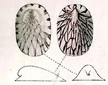 The height of the shell attains 6 mm, its diameter 4 mm. The shell is limpet-shaped. Its outline is oval. The apex nearly attains the posterior margin. In profile the posterior slope is very short and concave; the anterior is long and convex. It is highest near the apex. The surface of the shell is nearly smooth, with microscopic concentric growth lines. Its color is white, covered with a netted pattern of dots connected by lines of red. The minute apex is recumbent, spiral, and dextral. The tip is eroded. The inside is scarcely nacreous, the color pattern showing through.