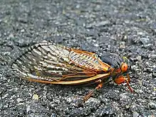 A cicada from the 2013 Brood II emergence rests on an elementary school parking lot.
