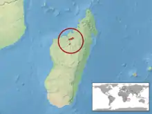 The toothed leaf chameleon is endemic to northwestern Madagascar, and its type locality is Suberbieville (Maevatanana).[2] It has been confirmed to be found at Andasibe, Mandraka, and Angavo-Anjozorobe. At the highest, the species can be found at 200 m (660 ft) above sea level. The International Union for Conservation of Nature has classed B. dentata as an endangered species on their IUCN Red List. It is listed as endangered because it is known only from the Ankarafantsika area, which covers 1,300 km2 (500 sq mi), although it could be found over an area of 2,700 km2 (1,000 sq mi) at the highest. The habitat of Brookesia dentata is continuing to decline due to charcoal collection, fires, and cattle.[1] The population of Brookesia dentata is currently decreasing like the habitat.[1] It is currently protected under the Madagascar law, and collection of the species is permitted with permission to do so.[1]
