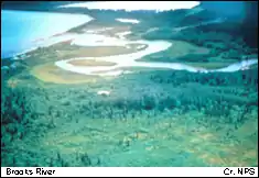 The Brooks River is a relatively short river which connects Brooks Lake to Naknek Lake on the upper part of the Alaska Peninsula in Katmai National Park and Preserve. The river is the site of a salmon run that attracts large numbers of bears, and has been used since the establishment of the park as a hunting, fishing, and sightseeing location. Brooks Camp is located on the north bank of the river, near Brooks Falls. Since the 1960s the area has been the subject of regular archaeological activity, often in regard to the management of the facilities at the camp. This research has regularly exposed evidence of human habitation in the area.[4]
