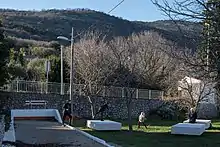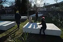 "Strokes and Incisions", a site-specific art installation authored by Danish-Austrian artist Sofie Thorsen can be found in the small park next to the bocce court at the very entrance to Brseč. Thorsen was inspired by a primary school in Brseč closing after more than one hundred and seventy-five years of continuous work. The installation consists of three stone objects whose shapes and colors symbolize paper, and the incised lines represent a fountain pen. The engraved forms were created on the basis of three pre-existing inscriptions: scribbles from old student notebooks from the closed school, graffiti from a street in Brseč and fragments of manuscripts by Eugen Kumičić.[4]