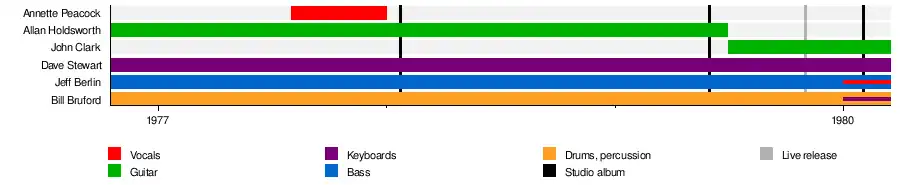 Bill Bruford formed the jazz-fusion band for his debut solo album Feels Good to Me, with keyboardist Dave Stewart (formerly Hatfield and the North), American virtuoso bassist Jeff Berlin and guitarist Allan Holdsworth (formerly Soft Machine and Pierre Moerlen's Gong). This first album also featured Annette Peacock on occasional vocals and British jazz stalwart Kenny Wheeler on flugelhorn. Bruford and Holdsworth then joined the progressive rock group U.K. After Bruford and Holdsworth left U.K., a second album One of a Kind enlisted the same line-up as the first album (minus Peacock and Wheeler) and was all instrumental. On the live album The Bruford Tapes (a show originally broadcast for radio station WLIR), guitarist John Clark (formerly of Quasar) replaced Holdsworth. Clark remained and bassist Berlin sang vocals for the first time on the third album, Gradually Going Tornado, which also featured "Joe Frazier", Berlin's first composition for the group.