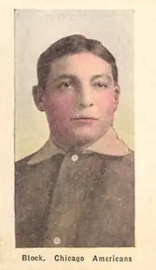 James "Jimmy" John Block (born James John Blochowicz on March 13, 1885 – August 6, 1937) was a catcher over parts of five seasons in Major League Baseball. He was known during his playing days as Jimmy Block. He reported to the Washington Senators the same day that Walter Johnson made his major league debut. Jimmy Block caught "Big" Ed Walsh's no-hitter on August 27, 1911.[1] He married Maria Czaplewski of Milwaukee with the marriage license filing date of October 6, 1910.[2] After his baseball career ended, he became a salesman for the Miller Brewing Company[1].