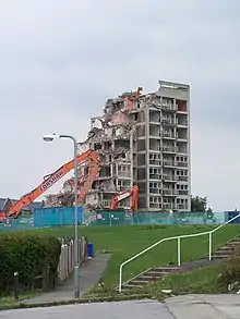 Chantrey was in slightly better condition, and after minor remedial work, remained in use as residencies reserved for people over State Pension age. This did not last long however, as it too was condemned a decade later. Chantrey was subsequently demolished on 29 April 2012 using controlled explosives, with demolition being carried out by Demex Ltd., a local contractor.[23]