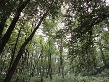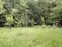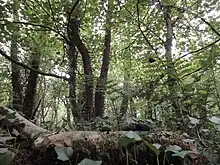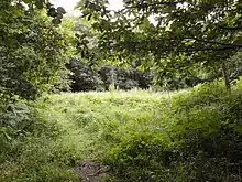 The wet triangle is a small (1/2ha approx.) isolated area found within this woodland with its own completely individual character. It is extremely wet and often retains free water during the winter months. Due to this a shade canopy has been unable to develop and so it is the only area of open wet woodland in the park. In 1989, the area suffered from vandalism and about a third of it was destroyed by fire, many of the original species in the burnt area were lost and it became colonised by bracken. The management of this area therefore focuses on the control and eventual elimination of bracken and the re-introduction of original species to the area leading to a thinning and coppicing regime in the future to ensure healthy growth.[7]