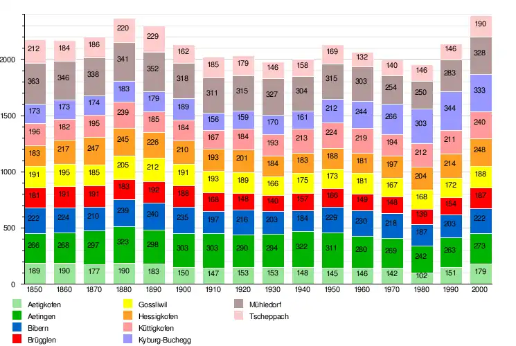 Aetigkofen is first mentioned in 1034 as Etikhouen.[4] Aetingen is first mentioned in 1267 as Etinge.[5] Bibern is first mentioned in 1366 as ze Bibron.[6] Brügglen is first mentioned in 1249 as Bruglon.[7] Gossliwil is first mentioned in 1246 as Gosseriswile. In 1276 it was mentioned as Goselwyl.[8] Hessigkofen is first mentioned in 1034 as Esikouen.[9] Küttigkofen is first mentioned in 1316 as obrenchúttenkouen.[10] Kyburg-Buchegg is first mentioned in 1175 as Ernaldus de Boucecca.[11] Mühledorf is first mentioned around 1264 as Mulidorf though this is from a copy from 1415-20. In 1276 it was mentioned as Mvlidorf.[12] Tscheppach is first mentioned in 1334 as Scheppach.[13]