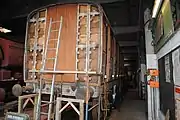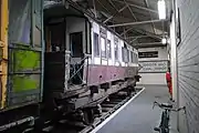LNWR 182 6-wheel picnic saloon. Built in 1894. Later grounded, body is now on an ex-LMS underframe of the same length. Now restored and operational, although inside Quainton Road workshop as of 3 March 2019.