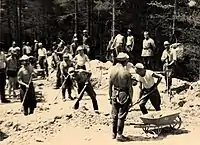 In August 1941, at the request of Adolf-Heinz Beckerle - German Minister Plenipotentiary at Sofia - the War Ministry relinquished control of all Jewish forced labour to the Ministry of Buildings, Roads, and Public Works.[57][5] Mandatory conscription applied from August 1941: initially men 20-44 were drafted, with the age limit rising to 45 in July 1942 and 50 a year later.[58][5] Bulgarians replaced Jews in the commands of the Jewish labour units, which were no longer entitled to uniforms.[5] On 29 January 1942, new all-Jewish forced labour battalions were announced; their number was doubled to twenty-four by the end of 1942. Jewish units were separated from the other ethnicities - three quarters of the forced labour battalions were from minorities: Turks, Russians, and residents of the territories occupied by Bulgaria - the rest were drawn from the Bulgarian unemployed.[59][5] The Jews in forced labour were faced with discriminatory policies which became stricter as time went on; with increasing length of service and decreasing the allowance of food, rest, and days off.[5] On 14 July 1942 a disciplinary unit was established to impose new punitive strictures: deprivation of mattresses or hot food, a "bread-and-water diet", and the barring of visitors for months at time.[60][5] As the war progressed, and round-ups of Jews began in 1943, Jews made more numerous efforts to escape and punishments became increasingly harsh.[61][5][62]