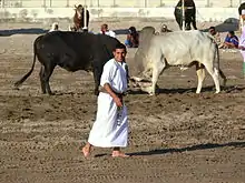 In Oman and the United Arab Emirates two Brahman bulls are presented to each other and allowed to lock horns and fight, while their handlers hold ropes to separate them if necessary.[12][13] The origins of bullfighting in Oman are unknown, though locals believe it was brought here by the Moors who had conquered Spain. Its existence in Oman and the UAE is also attributed to Portugal, which colonized the Omani coastline for nearly two centuries,[14][15] and also introduced bullfighting to Omani Zanzibar.[16]