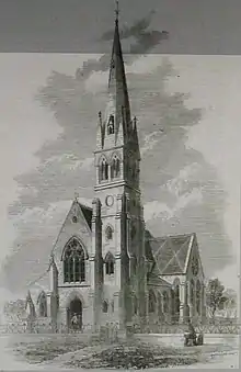 This church, on Church street, Hunslet, Leeds,[22] was designed by Perkin and Backhouse to replace a smaller one, due to the increasing size of the congregation. The foundation stone was laid in June 1862 by Mr B. Ingham, a local benefactor. The church was consecrated on Thursday 21 July 1864 by the Bishop of Ripon. The building had a tower, spire, clock, aisles and transepts. Inside were clustered shafts with carved capitals. The east and west windows were by Clayton and Bell of London, and the Caen stone reredos and font were by Burstall and Taylor.[23][24] Only the tower remains, after the nave was rebuilt, and consecrated on 9 July 1975.[25] St Mary's was at risk of closure in 2015, due to heating failure and deterioration of the fabric of the 20th-century building.[26][nb 1]