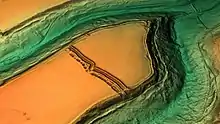 The contours of the land provide excellent natural defences to the north and east sides. On the southwestern side, where there are no natural defences, there is a further ditch 4m wide and 1m deep and an outer rampart up to 2m high and 3m wide. These are crossed by many causeways, which could be interpreted as an indication that the construction of the monument was never fully completed. The entrance in the middle of the southwestern side is thought to be of modern origin. At the northeastern corner, the inner bank turns inwards to form a funnel-shaped entrance leading to a hollow way running down the steep scarp into the valley below. Another entrance about a quarter of the way along the northwestern side also consists of inward-turning ramparts forming a funnel-shaped entrance.[1]