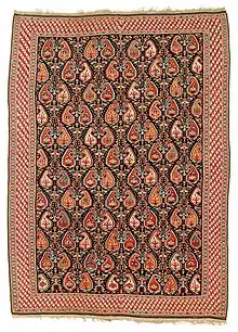 The boteh (Persian: بته), is an almond or pine cone-shaped motif in ornament with a sharp-curved upper end.[1] Though of Persian origin, it is very common and called buta in India, Azerbaijan, Turkey and other countries of the Near East.[1] Via Kashmir shawls it spread to Europe at least in 19th century, where patterns using it are known since 1960s as paisleys, as Paisley, Renfrewshire in Scotland was a major centre making them.